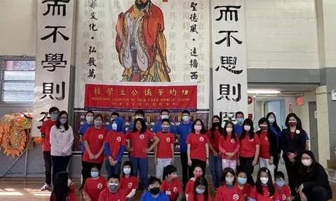 Entrega de una camiseta y un libro de texto en chino por New York Escuela China